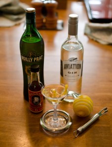 The Martini turned out well: cold and silky smooth, thanks to the stirring (never shake a true Martini). This was the first chance I’ve had to crack open the Aviation Gin, a recent purchase from Mac’s. Excellent! Certainly less juniper-forward than most London Dry Gins: more floral, more herbal, not harsh at all, and, perhaps, slightly sweet? A gin you could drink straight. The Noilly Prat Original is my go-to dry vermouth, though I’d love to get my hands on some Dolin Blanc. The bitters? Regan’s Orange Bitters No. 6, my current favorite, as they’re less medicinal than Angostura’s orange and not as sweet as Fee’s. A lemon twist is preferred over olives (which I don’t particularly care for, anyway). A 3:1 Gin to Vermouth ratio may work very well here in future experiments.