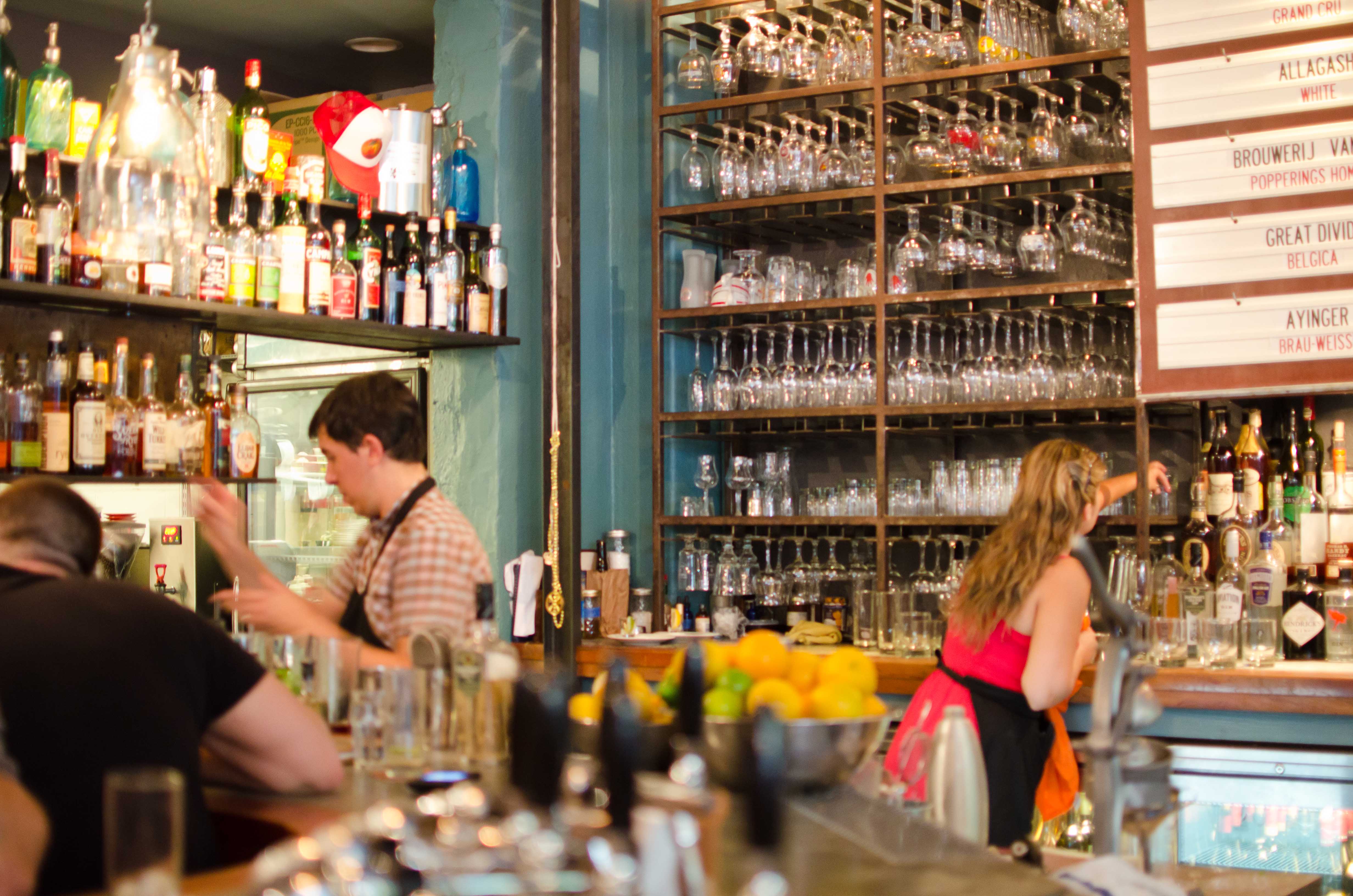 The bar itself is in the shape of a horseshoe: the mixing station (as seen above) is on the left, the beer pulls are front-and-center, in the bend of the shoe, while the right side acts as a service/cleanup station. Massive beer/wine chillers line the wall directly in front of you, flanked by glassware on the left and liquor on the right. Premium spirits line the countertops of the back-bar, while bitters and syrups reside over the mixing station. Oh, and those message boards? The slide to the left and right, revealing a further stock of liqueurs & spirits (so that’s where the Marie Brizard and Lemon Hart are hiding!). The metallic FULL SERVICE insignia presiding over this formidable sight suggests that this bar means business.
