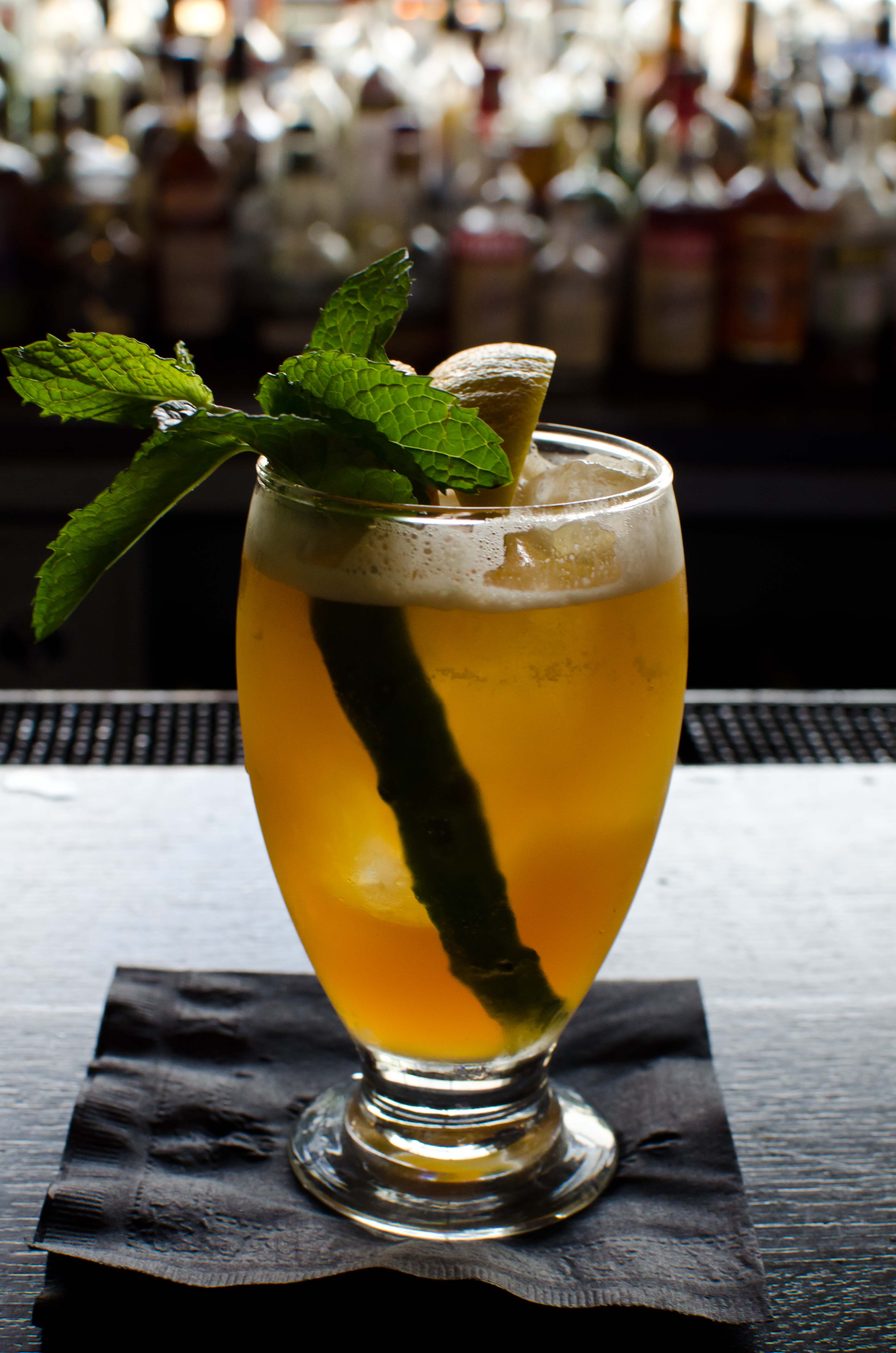 Bittercube No. 1 Jamaican BittersRinse, Top & Garnish: Green Chartreuse, Ginger Beer, Cucumber, Mint Sprig & Orange Wedges