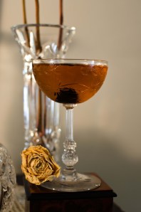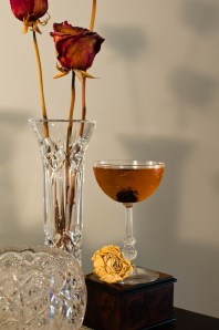 The yellow chartreuse, being less intensely herbaceous than the green variety, is floral and honey-like, and emphasizes the chianti-like nose of the calvados, while its herbal side, in combination with the Bénédictine and bitters, brings out the spicier characteristics of the calvados. The Widow’s Kiss makes an ideal after-dinner cocktail. If I had to tinker with this one, I’d like to reduce the liqueurs to 1/2 ounce each, reducing the sweetness of the drink, an opinion I seem to share with Erik Ellestad.