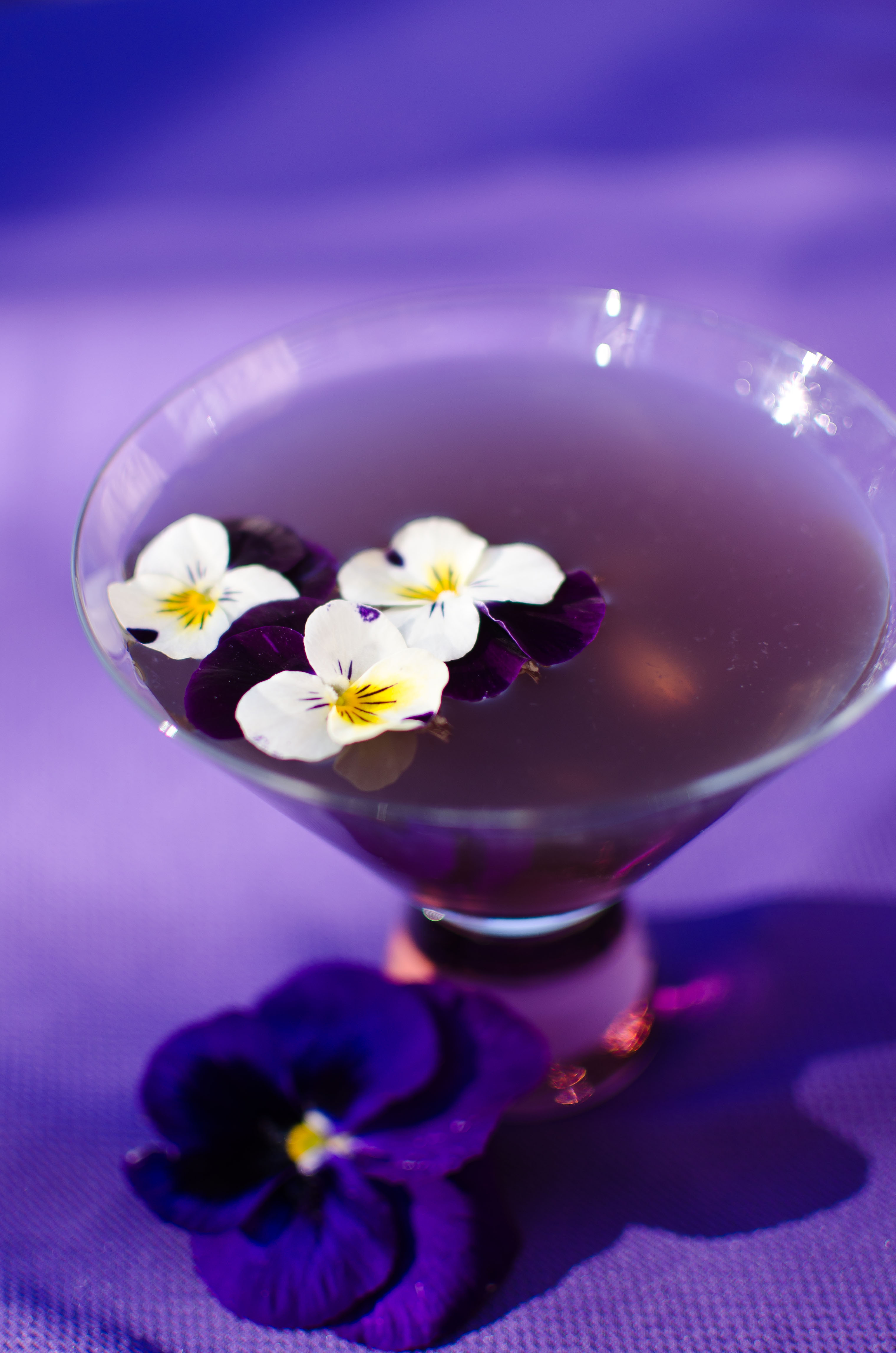 PS: Yes, I did cheat a bit on the photos, but only in the setup — the background cloth is a bright purple, and the stem/foot of the cocktail glass is a maroon-purple color. The white balance was corrected by sampling the white of the violas in the drink via Lightroom, but it didn’t undergo much alteration in the photos as-shot. The drink will be more of a gray in most lighting conditions.