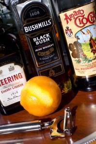 As a result of the aforementioned article and a visit to the faux-Irish bar at the New York, New York Hotel in Las Vegas, the Hutch in the basement now has three Irish whiskeys added to its stockpile: Tullamore Dew (decent and mild), Bushmill’s Black Bush (a wonderful blend, a bit maltier, with a hint of sherry), and Redbreast 12-year (a great all-around single-malt). The one that’s been used most frequently as of late is the Black Bush, which is specifically called for in the following drink, the Wilde Heart.