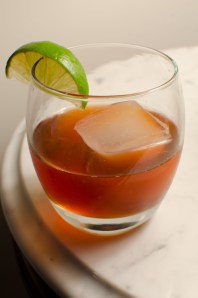 Squeeze of Lime Juice (1/4 – 1/2 ounce)Combine all ingredients in a double-rocks glass, add ice and stir. Garnish with the squeezed lime wedge. Alternatively, combine all ingredients in a mixing glass and stir with ice, then strain over a large ice cube in a double-rocks glass.