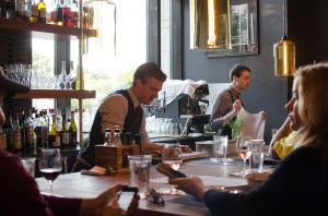 I was dining solo last Thursday, so I headed to the right of the entrance, where the bar and several small tables lay, and all of which were full (darn) except for the stools along the brushed metal wall. I normally like to sit at the bar and pick the minds of the bartenders, but unfortunately, no, didn’t happen that night: should have gone before the book signing! Ah well. The place was pleasantly busy, and from the sidelines I could watch the cocktail-slingers at work.