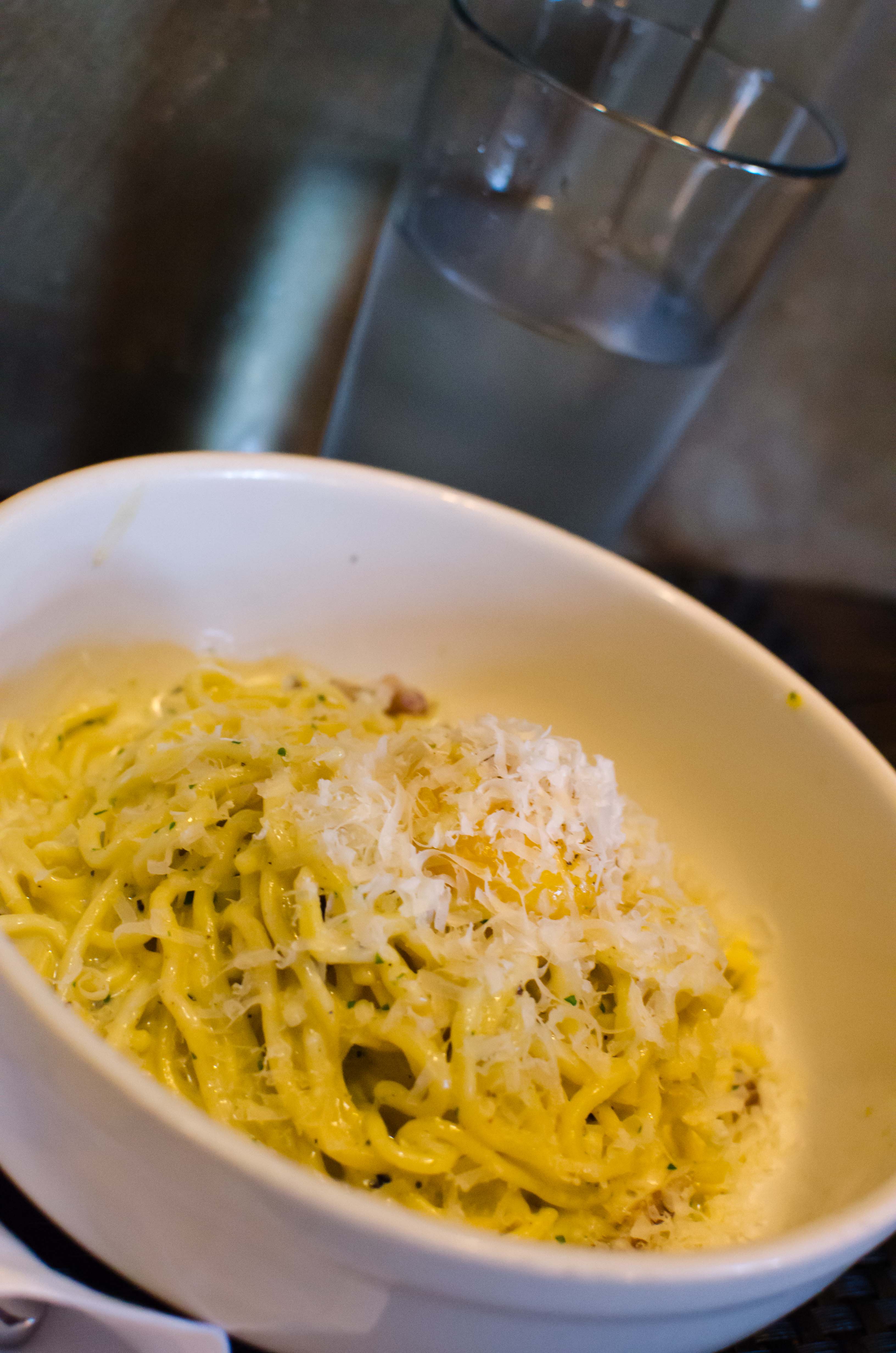Dinner arrived soon after the drink — Farm Egg and Pancetta Carbonara — and it was delicious, though I think I would’ve tossed a bit more pancetta in the bowl (can never have enough pig!). The eggy, cheesy pasta helped soak up the minimal amount of booze I was ingesting that night. For those who haven’t ordered food at the pub, they focus on cured meats — which hang in a case separating the bar and dining area — “whole-hog” offerings, and produce purchased from local farms. There’s also the mythical 10 o’clock burger — twenty- four served per night.