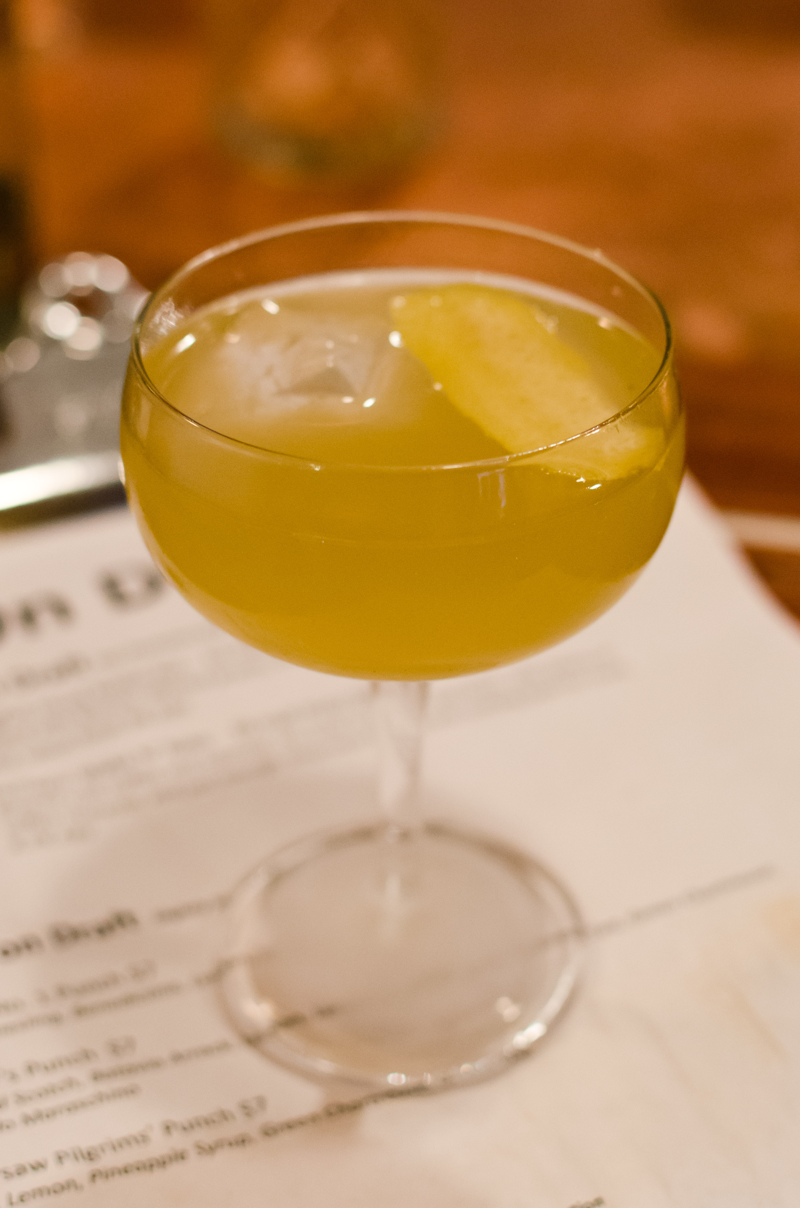 Following along with the Choose Your Category system myself, I asked James for something tart, along the lines of a punch, that involved Laird’s Bonded Apple Brandy. Out of the shaker came a Jack Rose — always a classic — with a couple extra dashes of Angostura bitters. The drink came out much the same way I make them at home — maybe a little easier on the brandy, which is nice, as the stuff can get rough — but the addition of bitters was nice touch, bumping up the depth and spice a wee bit.