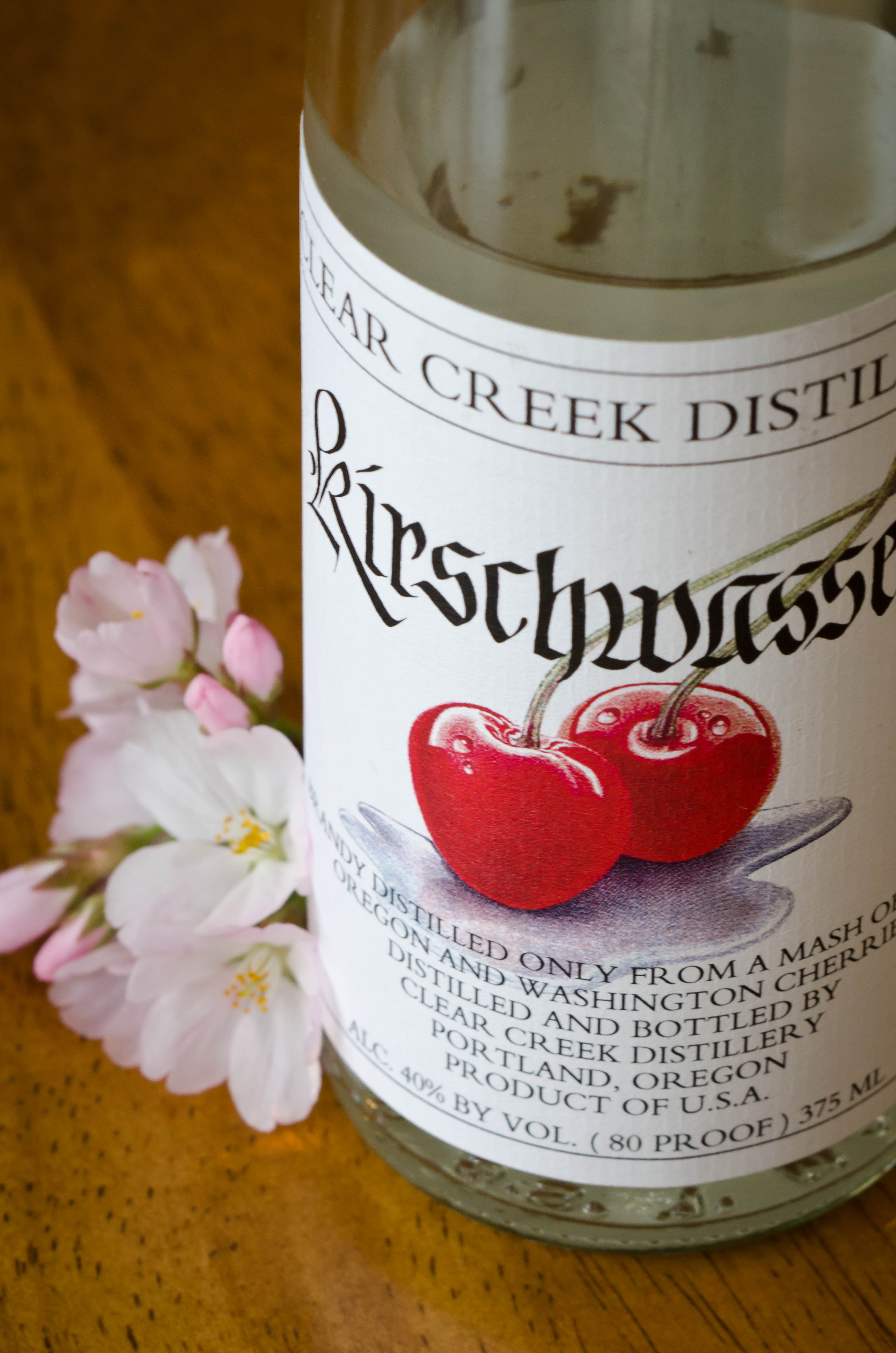 Kirschwasser, for those not in the know, is a clear brandy made from cherries. Kirsch does not “taste like cherries” in the way some cherry liqueurs do: instead, it hints of them…strongly, via a funky wallop of dry, spicy, aromatic flavor. Most eaux de vie and unaged brandies (like Pisco) contain this kind of taste — fruit intensified by fermentation and distillation — and it’s evident if you try a pisco or grappa next to a cognac or armagnac: same fruit, same flavor, but different ages and modifications. On its own, kirsch makes a nice apéritif or digestif. If you look for it, try Clear Creek, from Oregon, or Aqua Perfecta from California.