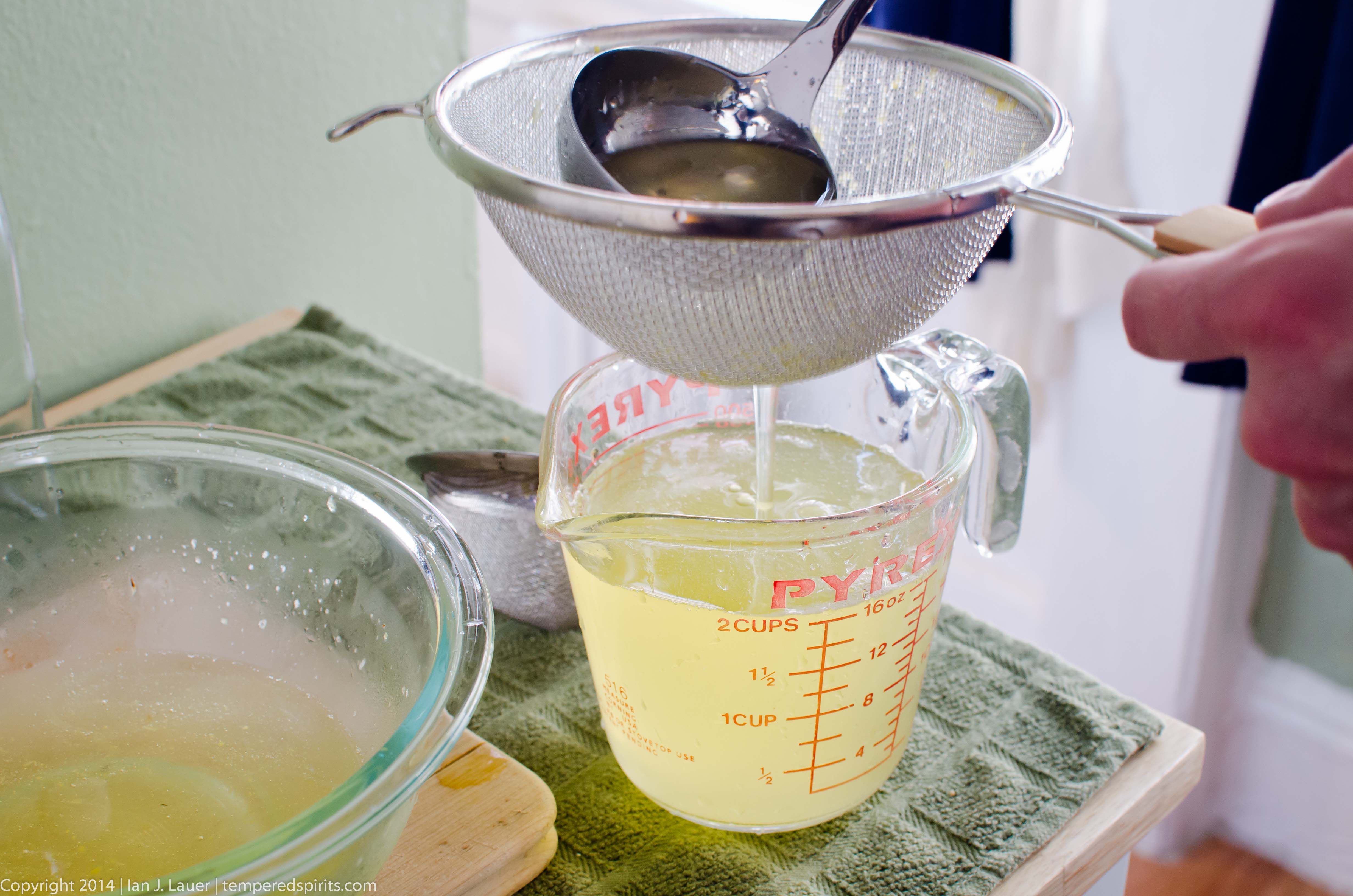 One frequently sees drinks calling for pineapple juice or pineapple syrup — most of them faux tropicals — but, being a bit lacking in fruit-whacking ambition, I often passed them by, leaving it to the Tiki bloggers and bartenders to deal with the spiky fruit. Morgenthaler’s methods and a determination to get back into the monthly MxMo swing of things convinced me to conduct an experiment involving the stubborn summer staple, however. So, in order to lengthen the lifespan of the juice as long as possible, I decided to mix up my first-ever batch of pineapple syrup. In actual fact, it’s quite a simple affair, though like all things made with care, it will take some time — about half a day, minimum.