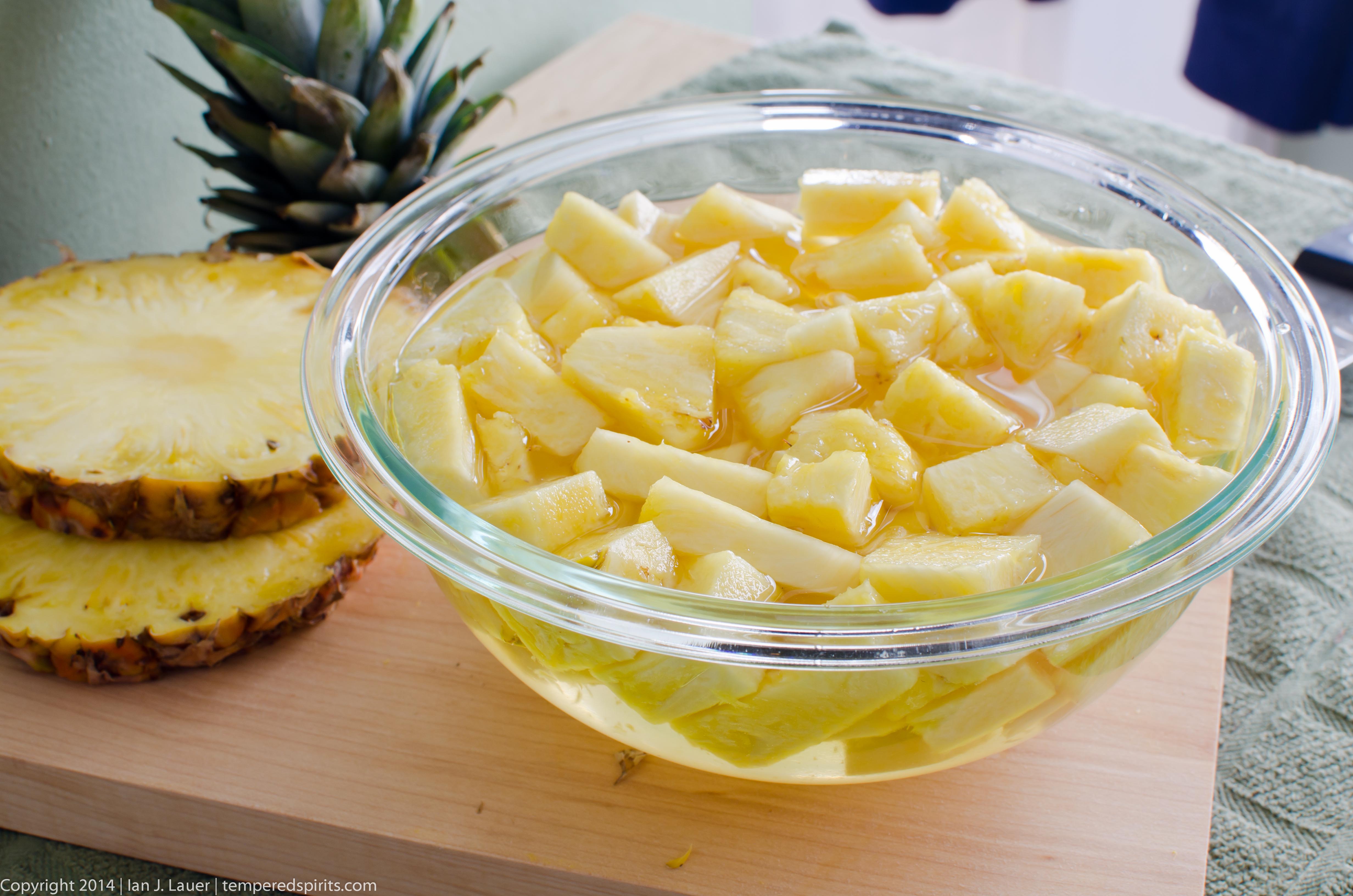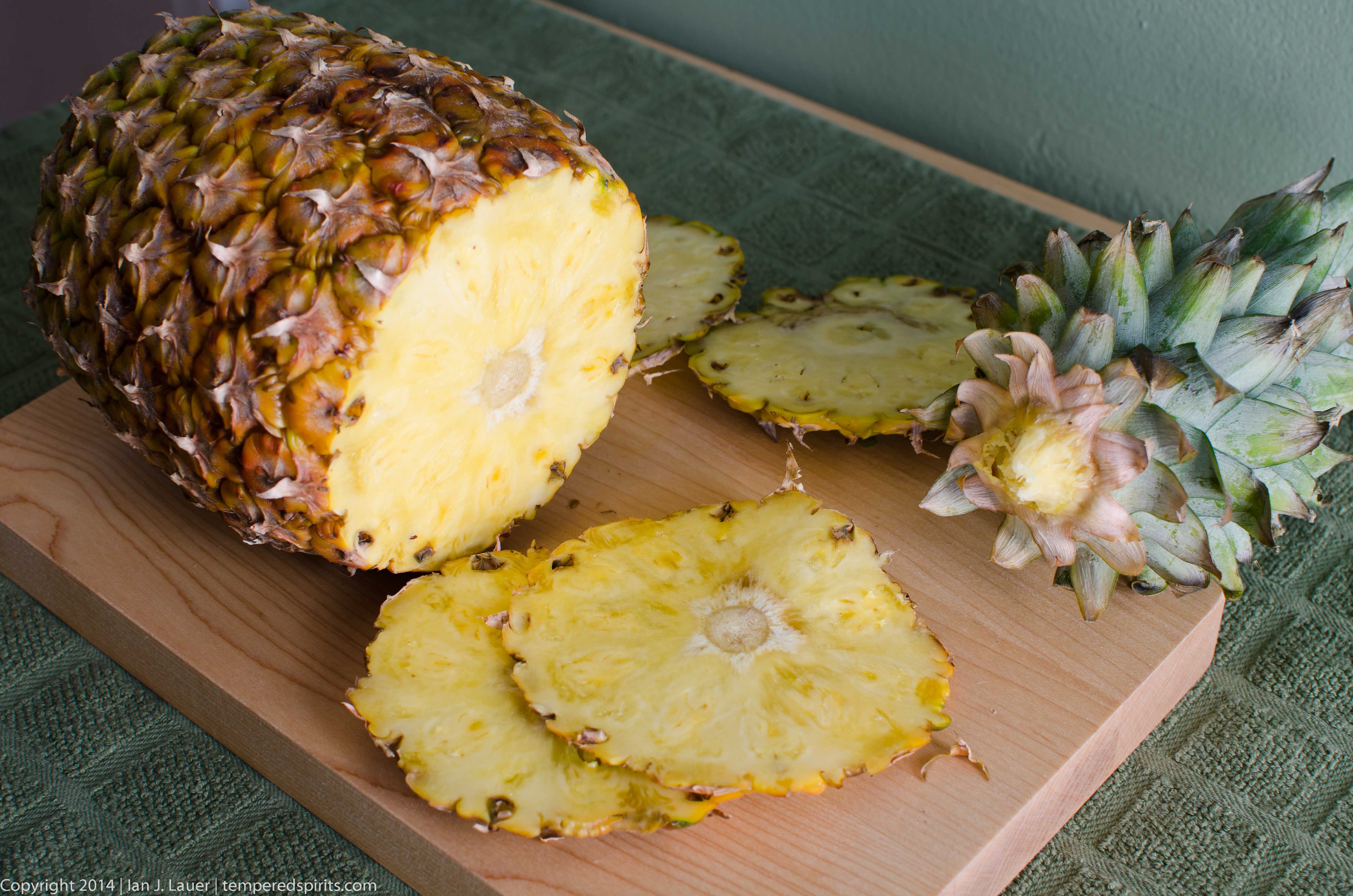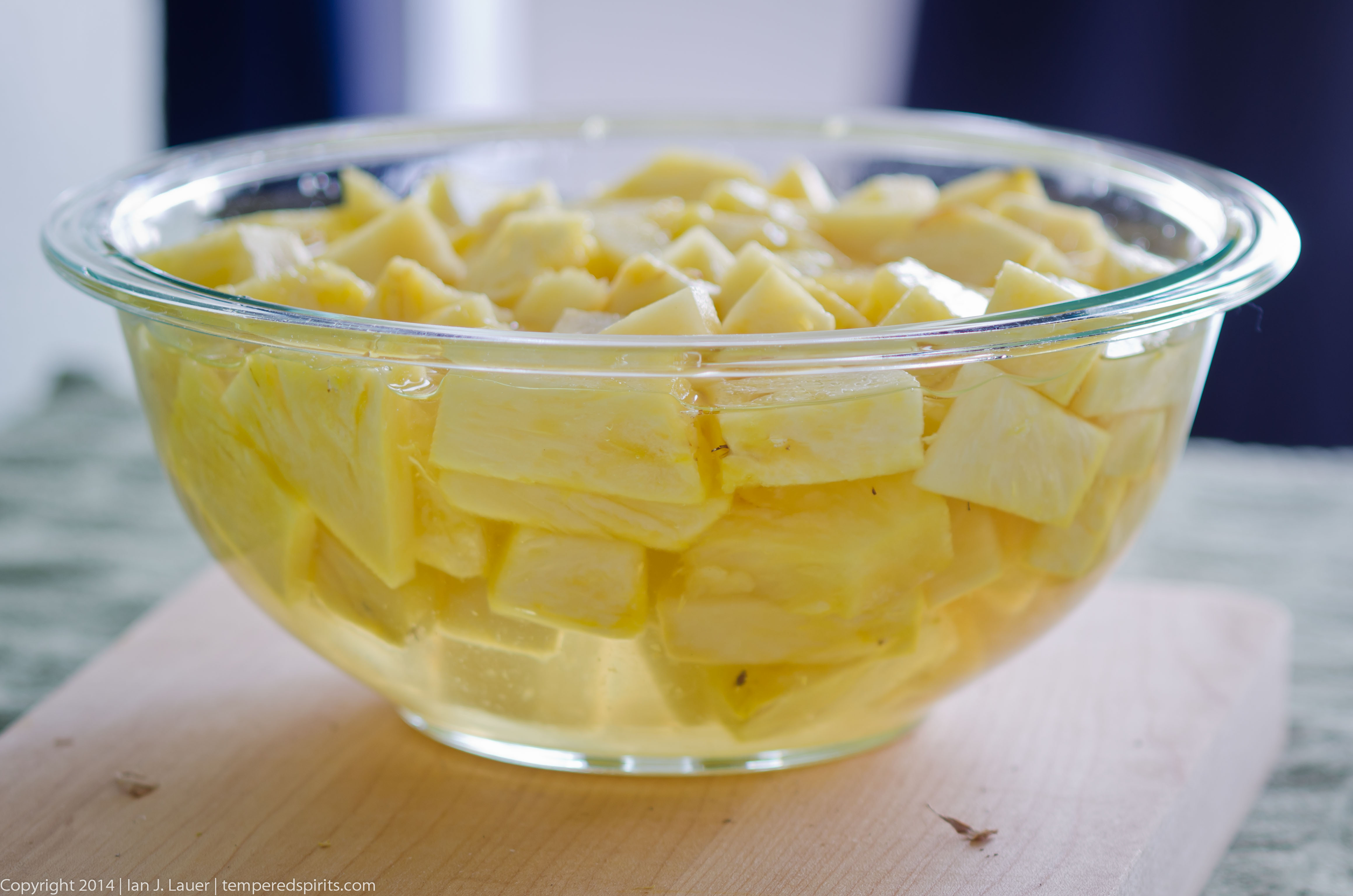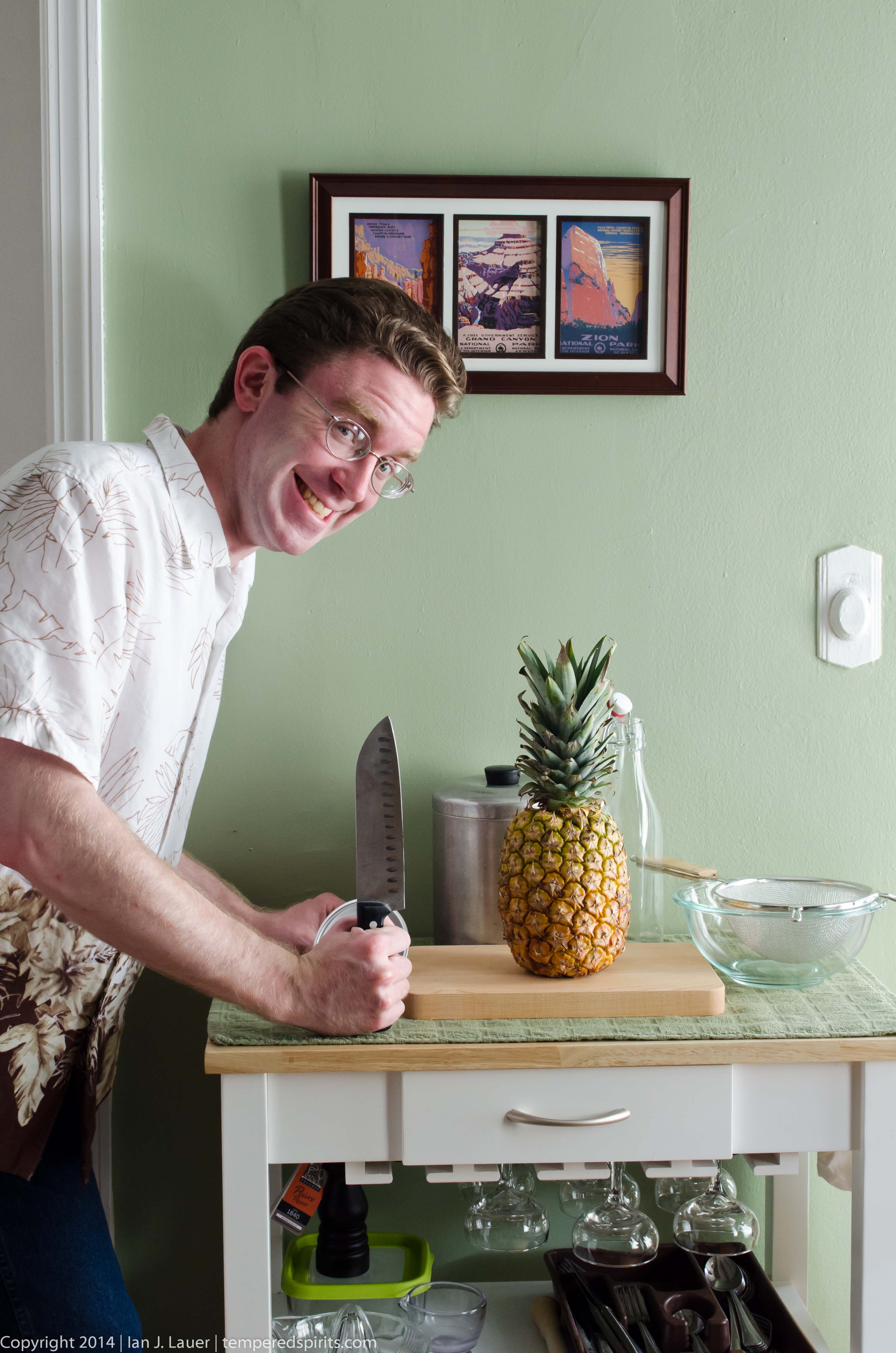 First off, find yourself a pineapple. You don’t need a huge one, just a fresh one. As Morgenthaler notes, pineapples are picked when ripe, so you should use them right away — no need for them to sit around on a countertop. Ideally, the flesh of the fruit should be firm but have a slight give to it when squeezed. It should also be redolent of pineapple when smelled through the thick skin (a bit tricky if the fruit is stored chilled, as I’ve seen in a number of markets — the chill seems to deaden the smell).
