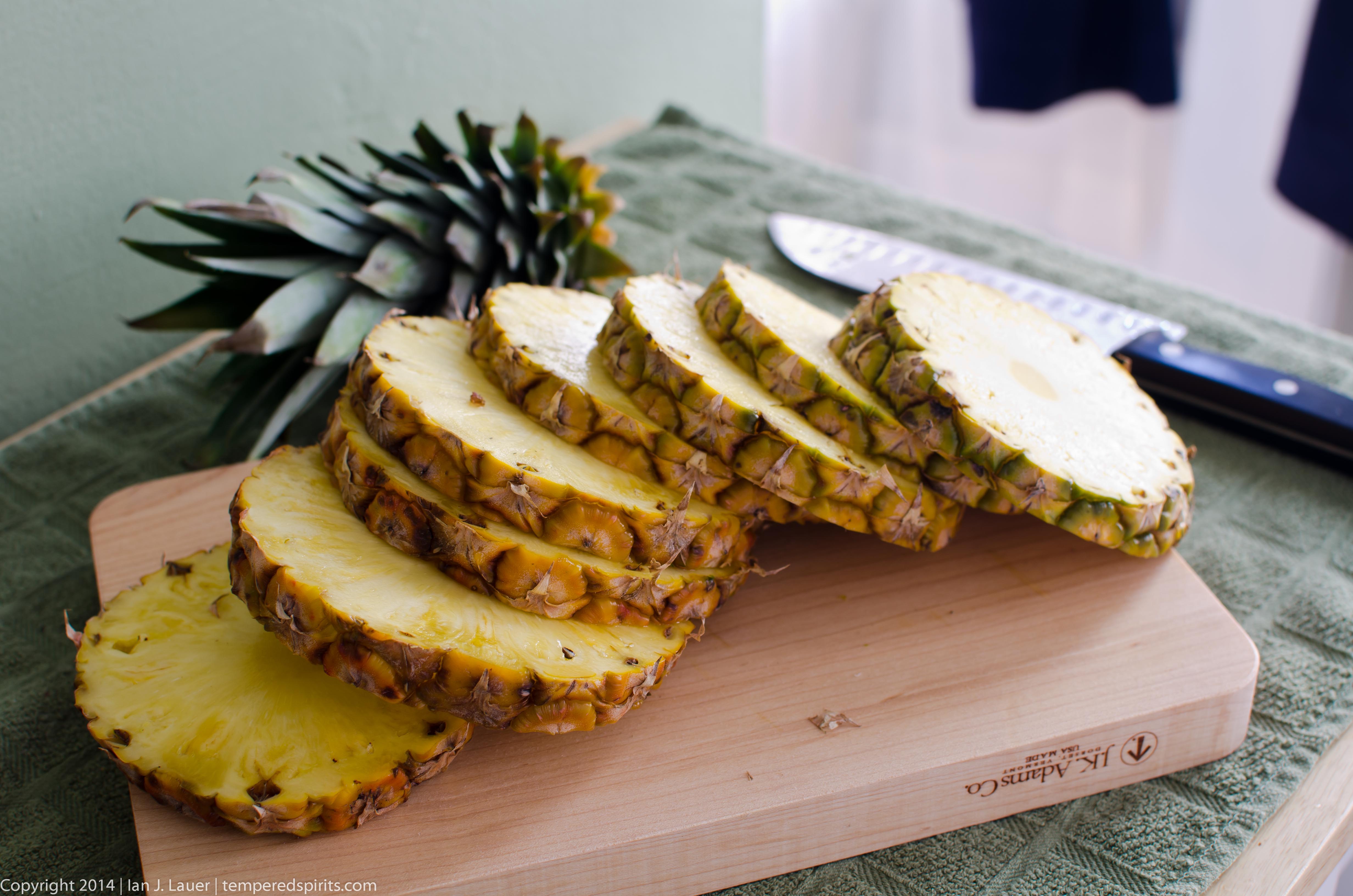 Ok, time for pineapple prep. First, twist off the leaves in a bunch, then chop off the “caps” on either end of the fruit. Slice the pineapple into sections a about 3/4 of an inch thick, then trim to thick skin off each section. Chop those section into wedges or chunks as wide as they are thick, discarding any especially tough bits of the core.