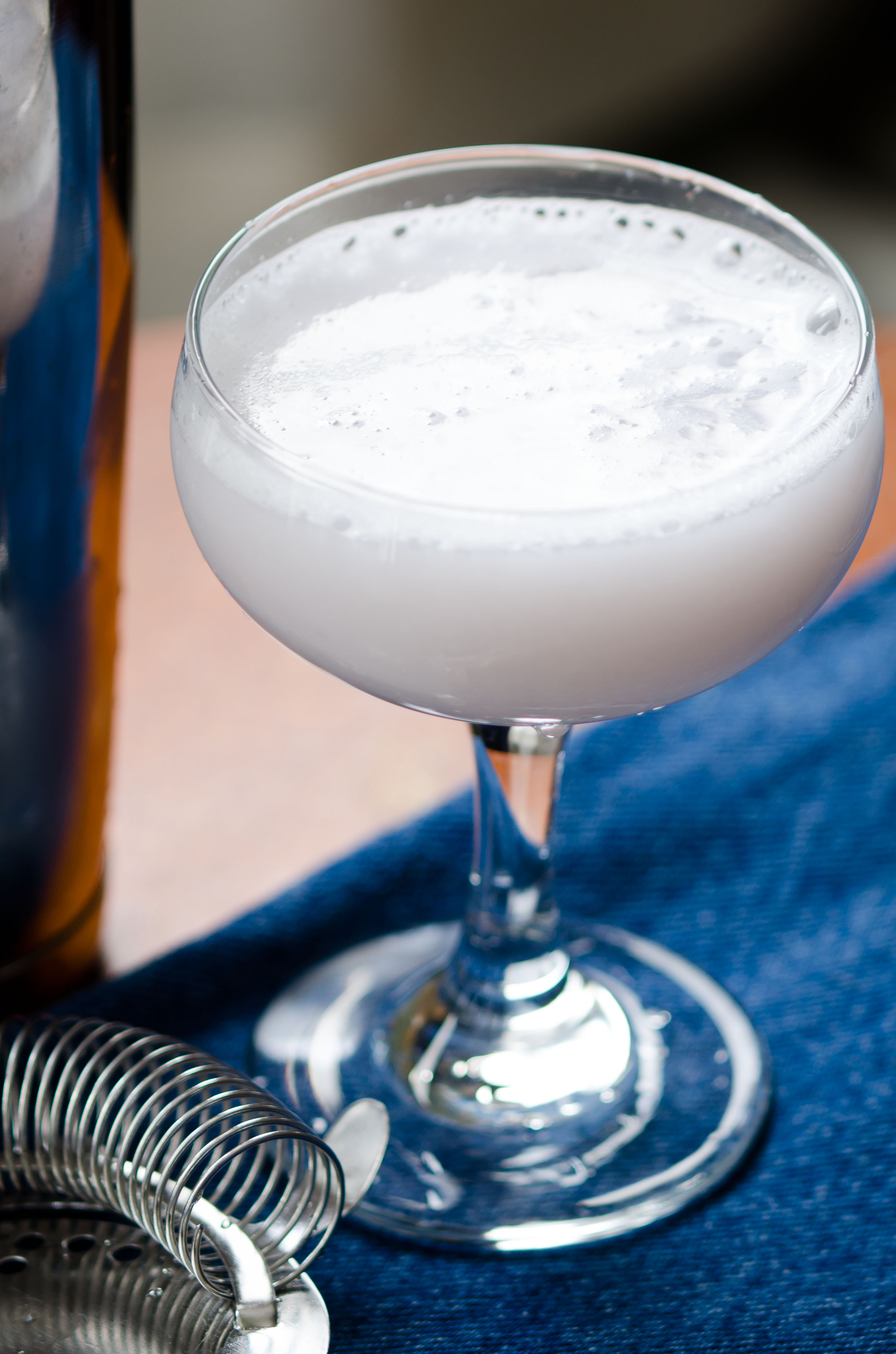 If you’re aiming for a cocktail that is blue in color — and one that avoids the dogmatically dangerous, artificially-colored blue curaçao — one of the obvious places to start is the Aviation cocktail. True, the Aviation is not a stark cerulean blue (more of a gentle periwinkle), but it has an ethereal cloudiness to it that ensures its appearance is in keeping with its moniker. The Blue Sky shares the Aviation’s coloration, but is quite different in terms of flavor: the emphasis here lies on the woody fruit of the peach brandy, which is boosted by the floral soapiness of the violette. I added the gin for a much-needed dose of honeyed, lemony spice and a touch of sweetness (I always add a dash of simple syrup to my Aviation), and as a great compliment to the Cointreau.